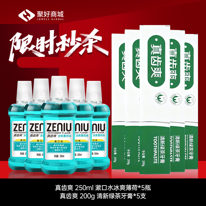 • 【限时秒杀】隆力奇真齿爽200g清新绿茶牙膏*5+真齿爽250ml漱口水冰爽薄荷*5