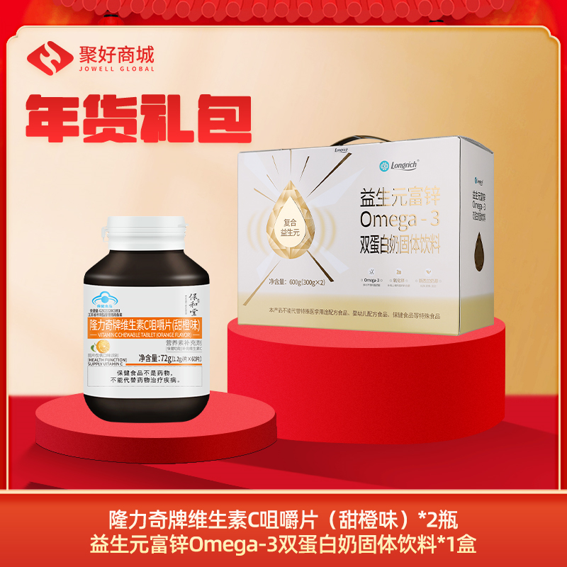 • 【年货礼包】益生元富锌0mega-3 双蛋白奶固体饮料(两罐/盒)*1+隆力奇牌维生素C咀嚼片*2